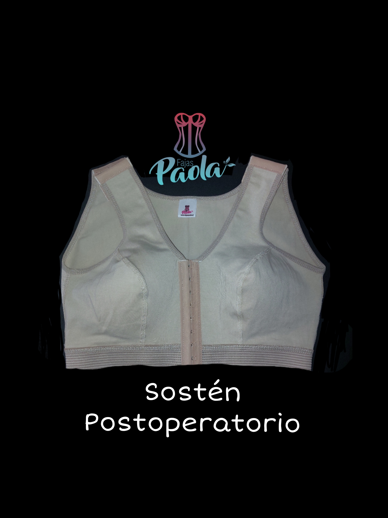 Sostén postoperatorio corte princesa, espalda alta, confeccionado en lycra Dupont. Broches delanteros y en hombros de 3 posiciones. Ideal para aumento o reducción mamaria y reconstruccion mamaria.